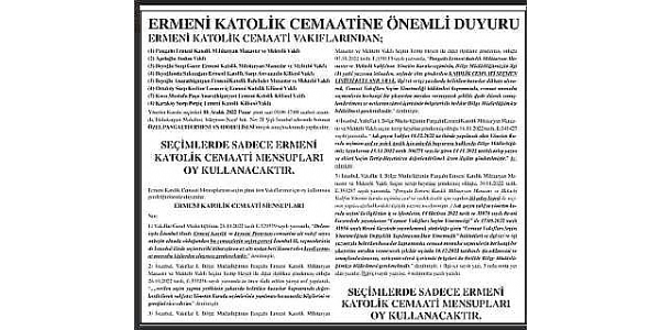SEÇİMLERDE SADECE ERMENİ KATOLİK CEMAATİ MENSUPLARI OY KULLANACAKTIR.